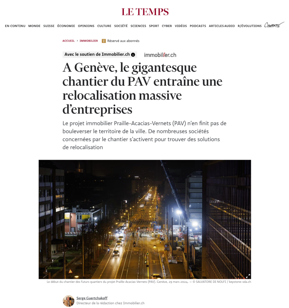 Le journal Le Temps met en lumière Quarz’Up Le journal Le Temps avec immobilier.ch, a consacré un article à l’impact du chantier du PAV (Praille-Acacias-Vernets) sur les entreprises genevoises et aux solutions immobilières mises en place pour leur relocalisation. Quarz’Up y est cité comme l’un des projets répondant aux besoins concrets des PME et PMI confrontées à ce […]
